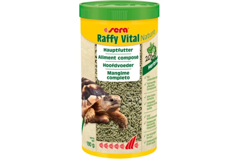 Sera Raffy Vital ist das Hauptfutter für Landschildkröten und alle anderen herbivoren Reptilien aus schonend hergestellten Sticks und Kräuter-Tabs. Die Mischung mit vielen Gemüsen, Algen und Kräutern wird ausgezeichnet angenommen. Diese naturnahe, ausgewogene Rezeptur ist reich an Vitaminen, Mineralien und Ballaststoffen. Die – in geeigneten kleinen Mengen – ebenfalls enthaltenen hochwertigen Proteine und Omega-Fettsäuren ergänzen optimal den Bedarf. Die Abwehrkräfte, die Vitalität sowie das gesunde Knochen- und Panzerwachstum werden gefördert.